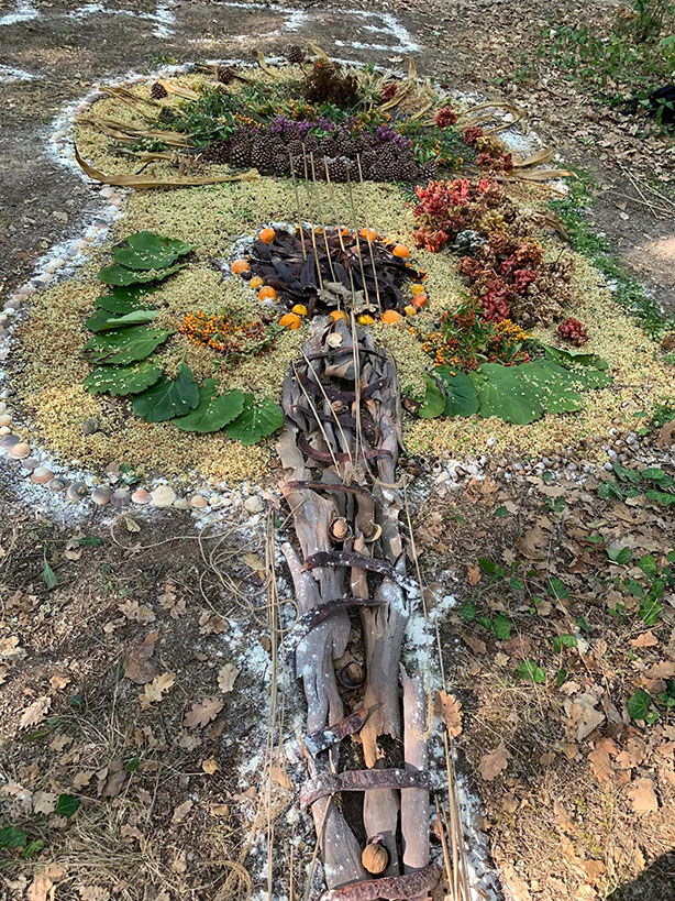 Le land art est une œuvre faite en collaboration avec l’environnement. On pénètre avec respect dans la nature, dans le bois, la forêt… pour créer une toile avec ce que l’on trouve sans détériorer le vivant, pour la mettre en forme, en mouvement, en créant une dynamique visuelle. C’est un peu comme si on instaurait une communication entre la nature et nous par cet échange. Elle nous offre des présents… et nous une mise en beauté de ses éléments dispersés, que l’on rassemble pour faire une création colorée en fonction des saisons, de l’évolution des végétaux tout en respectant le lieu, les fleurs, les plantes, les arbres… Cette création va totalement s’intégrer dans le paysage et va demeurer un certain temps puis disparaitre progressivement.